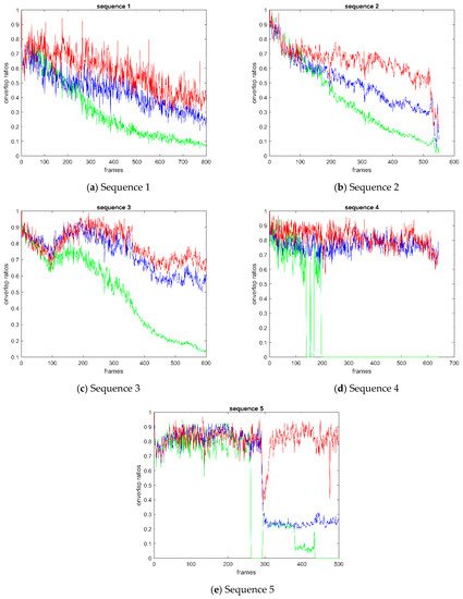 Curve of overlap ratio between predicted box and real box: (a) sequence 1; (b) sequence 2; (c) sequence 3; (d) sequence 4; (e) sequence 5. The points on the curves indicate the overlap ratio between the predicted bounding box and the ground-truth bounding box.