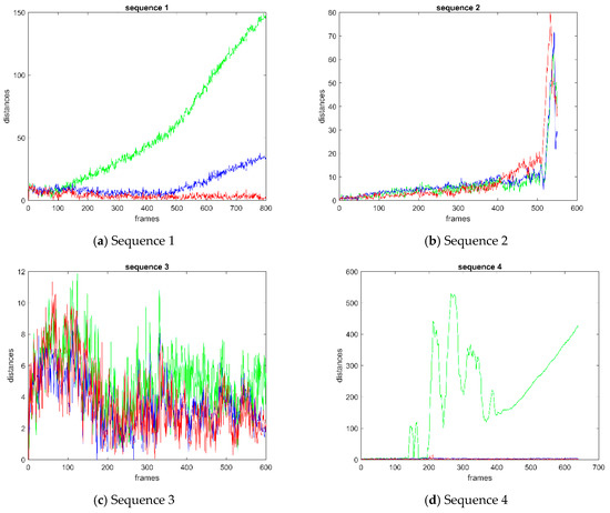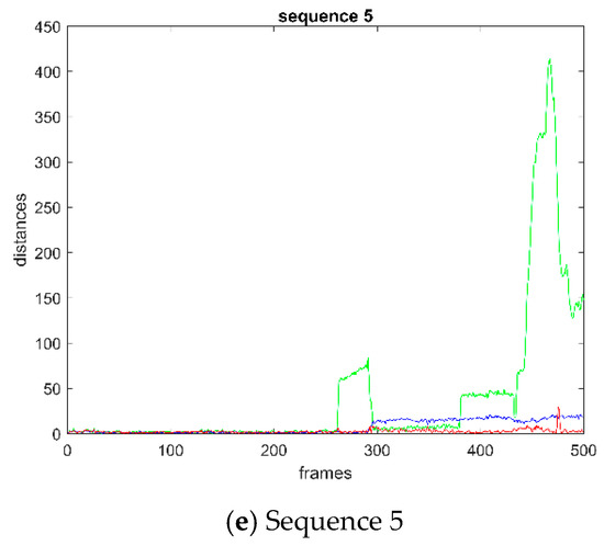 Curve of distance between predicted box and real box: (a) sequence 1; (b) sequence 2; (c) sequence 3; (d) sequence 4; (e) sequence 5; (f) sequence 6; (g) sequence 7. The points on the curves denote the distance between the center of the predicted bounding box and the ground-truth bounding box.