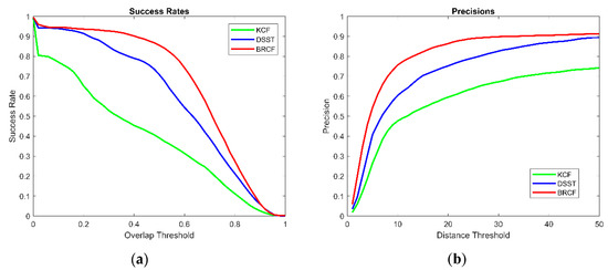 Figure 11b shows the curve of precision over the distance threshold of BRCF and KCF as well as DSST. Distance is calculated by the Euclidean distance between the center pixels of two bounding boxes. When the distance of the predicted bounding box and the ground-truth bounding box is lower than a certain threshold value, the tracking of this frame is precise. The precision is the ratio of the number of precise frames to the total number of frames in all video sequences. It can be seen from the figure that the precision of the BRCF is higher than that of the DSST and KCF in all scale ranges.