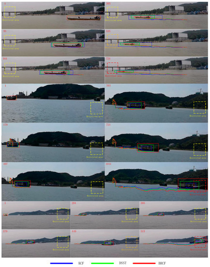The detection of abnormal events on the sea by the three tracking methods KCF, DSST and BRCF on the three video sequences are shown in Figure 12. In a Smart Ocean system, one of the most important tasks is to detect and track abnormal events and illegal ships on the sea. A restricted area is set in advance for anomaly detection. When the ships sailing near the preset restricted area, the system will give an alarm. The color of the dashed rectangle reflects the distance between the moving ship and the restricted area. As the ship moves closer to the restricted area, the color of the rectangular box becomes darker until the alarm is triggered. The curve connected to the bounding box represents the tracking trajectory of each algorithm for the target ship. The red number in the upper left corner of each frame indicates the serial number in the video sequences. It can be seen that the scale of the target box of KCF method cannot adjust the box size when the object size changes. The bounding box of DSST can adjust its size according to the change of object scale, but it cannot change the aspect ratio of the box. Once the object is deformed, the rectangle box will not be able to wrap the object tightly. The proposed BRCF method is more adaptable to the deformation of objects and other scenes. It can adjust the scale freely following the shape change of objects.