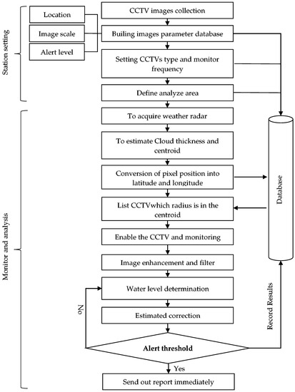 As the climate has been changing, global rainfall patterns have been constantly changing. According to the Global Climate Observing System (GCOS), rainfall in many cities in the world is getting more severe and is changing drastically [1]. Taiwan is located in a region with frequent natural disasters, where short-duration heavy rainfall often causes flooding in urban regions due to the fact that excessive rainfall cannot be drained within a short period of time in the regions, which usually causes considerable economic losses. The increasing incidence and severity of floodings poses a threat to most cities around the world [2,3]. When floods threatening people’s lives occur in low-lying areas, the needed manpower and physical resources that have to be mobilized for evacuation and withdrawal make disaster relief operations more difficult. These days, early warning systems are widely used in flood disaster and water resources monitoring and forecast, which collect fixed-point and fixed-time information through monitoring hardware devices, such as sensors or water level gauges. Yet, they lack image data to prove whether the gauged target is the actual water level or another object. The forecasts from existing early warning systems are given on the basis of the risk models established through historical data or satellite cloud images; however, the low specificity and the inability to achieve localized regional analysis are the present disadvantages [4]. For these reasons, this research aims to develop technology using images of ground weather radar to automatically determine the position of the cloud cover and in turn predict possible rainfall areas. Additionally, the connection to the distant monitor for real-time remote image data within a specific range of the rainfall area automatically enables for CCTV (Closed Circuit Television System) images to be interfaced and analyzed. Furthermore, flood identification and the flood depth calculation can be carried out with the image analysis technology and processing method, which can serve for urban intelligent monitoring and early warning and provide the disaster relief unit with the analytic results for reference. Hence, ARMT (automatic combined ground weather radar and CCTV images for real-time flood monitoring) was developed in this study and the related algorithms are described below.