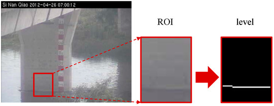 For water level estimation, the CCTV camera images are firstly subjected to grayscale conversion and image intensification. Since the water surface for analysis is likely in a non-horizontal plane, there is a need to perform horizontal correction and define the image scale of the actual water depth before the analysis starts. Due to the fact that the camera does not always face the front horizontally, it is necessary to correct the level of the detected object into the horizontal to facilitate the detection of flood depth. This is performed mainly by selecting four points on the image, the first two of which are done on the water surface and used to calculate the slope for correcting to horizontal by image rotation. The latter two points are done at tow target objects with the known actual height. For example, suppose that a window and the ground are known to be 130 cm apart and by selecting these two image positions, we determine the difference between the two points to be 120 pixels. By this, it can be extrapolated that a pixel amounts to 1.08 cm. During the analysis, the ROI function is used to select the water depth identification region (Figure 6). This method can not only increase the computing efficiency but also reduce the foreign object interference in the image region and improve the accuracy of flood depth calculation [9,10,11].