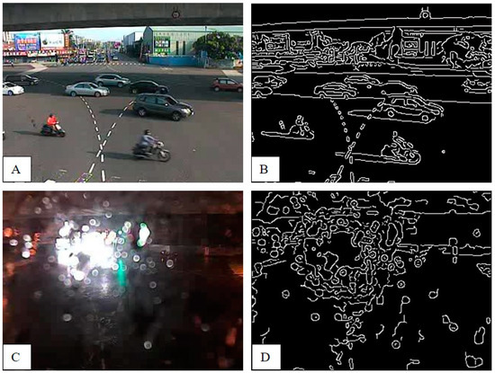 The edge analysis. (A) CCTV image in normal case. (B) The edge detection of A. (C) CCTV image with raindrops. (D) The edge detection of C.