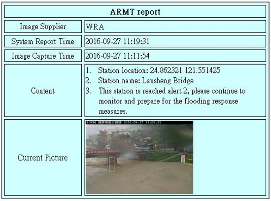 During monitoring, if the water level/water depth reaches the alert value (e.g., the water level of 112.5 m at Lansheng Bridge is alert level 2), which is automatically detected by the system, the system will send an e-mail report to notify ARMT users. After sending the e-mail, the log message will be recorded in the process database. The warning message includes the supplier of the image, image captured time, system report time, message content description, and the current picture, etc. (Figure 8).