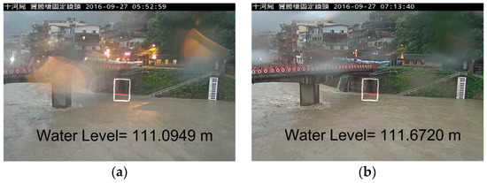 As for the image identification, the CCTV camera images are initially procured, followed by selecting the identifying area of an obvious target object (as shown in the box of Figure 3) for water level/water depth determination and dissection. After the target object is selected, we use four image features—entropy, edge value, discrete cosine transform (DCT), and signal-to-noise ratio (SNR)—to conduct the image classification and selection and get the estimated data of water level, which is subsequently converted into real water depth through the pixel scale and is documented in the database.