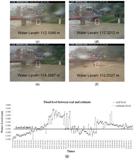 Real-time image water level monitoring and analysis. (a–f) The monitoring course of typhoon Megi. The white box represents the region for analysis. The white line in the box represents the estimated water level. In the (f) panel, it is obvious that the flood water level exceeds the analyzing region; hence, the water level could not be correctly identified. (g) The progress of the water level analysis of a monitoring cycle. Real line was shown for the level of flood alert 2. The RMSE (root mean square error) and MAE (mean absolute error) were 41.41 and 21.86 cm, respectively. The water level is defined in reference to sea level (i.e., height above sea level or elevation).