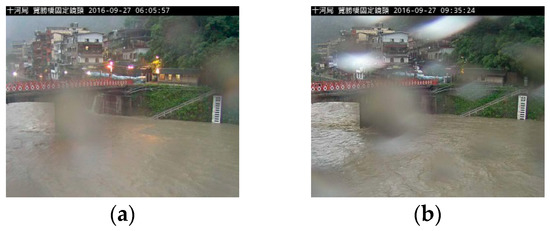 In order to improve the accuracy of the estimated water level, the screen and filter method of CCTV images was necessary. According to the literature, entropy, edge value, DCT, and SNR were used as image features in defining whether CCTV images can be used to estimate the water level or not. The entropy was mainly the “indetermination” of the image pixel value. As the image was more complex, the entropy value would be higher. For example, if the CCTV image included raindrops, the entropy would reduce because the texture was smoother. Furthermore, a blurred image would also get a low entropy value. The edge value was calculated through different brightness gradient values. If the image quality was clearer then it would get more edge line, otherwise it would be less (for example image with raindrops, image blurring, etc.), and the edge line would also be discontinuous (Figure 4).