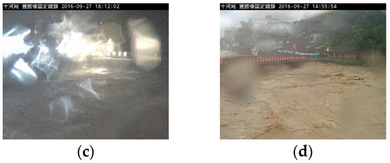 In this study, not only the historical image data from four monitoring stations but also real event scenario data from six monitoring stations during a typhoon in Taiwan (typhoon Megi) were tested for water level identification and reliability. The reliability examination was performed by comparison between the image identification result and actual water level. In the historical event analysis, from each station 180 to 200 images were collected, respectively, in the sizes of 352 × 288 (pixels) and 352 × 240 (pixels) and image scales ranging from 0.60 to 8.55 cm/pixel. Under the condition that the estimation error of the identification was less than 50 cm, the average calculated reliability was 88% (Table 1). In the real application of this developed technology in all-weather flood monitoring and analysis during a typhoon in Taiwan, data from six monitoring stations—Nangang Bridge, Xinan Bridge, Jiquan Bridge, Baoqiao Bridge, Shanggueishan Bridge, and Lansheng Bridge—were collected at a frequency of one image per 5 min, the image size of which was 704 × 480 (pixels) and the image scales ranged from 2.86 to 14.44 cm/pixel. Under the condition that the estimation error of the identification was less than 50 cm, the reliability of the water level estimation with respect to the flood monitoring was between 79% and 93% (Table 2). The hit, miss, and false alarm statistics from six stations are listed in Table 3. The rates of hit estimated from six stations were higher than 92%. The maximum false negative rate (Miss) and false positive rate (False) from six stations were 6% and 3%, respectively.
