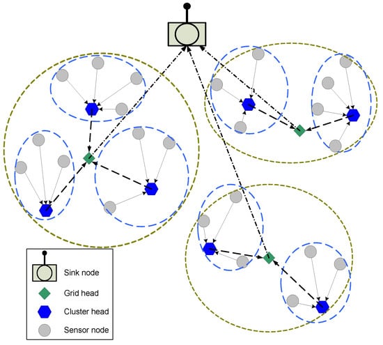 Nodes with CH role collect data from sensor nodes, compress it, and transmit it toward GH, which in turn forward them toward sink, while the rest of the sensor nodes sense the environment, collect data, and transmit it to their CH.