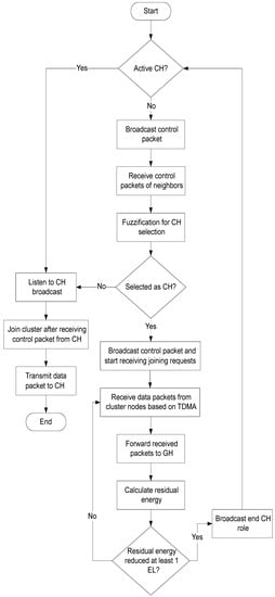 Unless the residual energy of a sensor node that is selected as CH is not decreased by EL, it remains as CH, and no reselection process of CH take place. Whenever the CH residual energy decreased by EL, it broadcasts a control packet announcing end of its CH role. Thus new CH selection process start. The working procedure of the proposed mechanism is further explained in a flow chart which is shown in Figure 3.