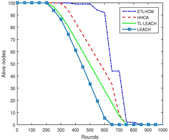 The overhead of the proposed algorithm is that when the batteries of sensor nodes reach to final stage, the graph of alive nodes falls sharply, as can be seen in Figure 4. The reason behind this is that nodes assigned as forwarders in the proposed algorithm do not change their state until their residual energy falls from a certain limit which is comparatively much larger than that of HHCA and other protocols, as explained in Section 4. Once all node batteries in the cluster reach the final stage, they start dying out frequently.