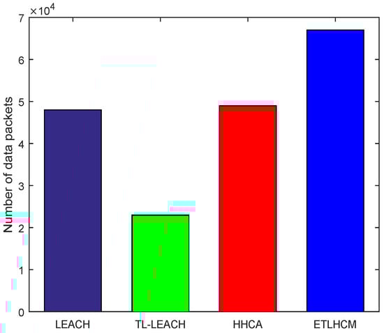 In Figure 5, the total number of data packets transmitted and successfully received at base station are shown. The proposed scheme appears to have better result from HHCA, TL-LEACH, and LEACH protocols due to longer network lifetime. The good amount of energy that is used in other schemes during selection of CHs is saved to a large extent in the proposed scheme, and thus nodes remain alive for longer periods of time. This results directly in increasing the total number of successfully delivered data packets from sensor nodes to the base station. As many nodes die out in the network, that probability of data packet drop increases. In the proposed mechanism, sensor nodes remain alive for a longer time and thus the ratio of data packet drop is reduced.