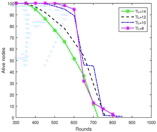 Network lifetime of proposed mechanism with different energy Total Level (TL).