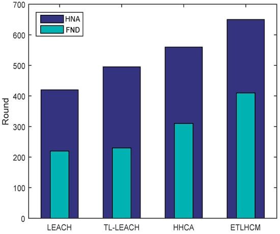 Network lifetime based on First Node Dies (FND) and Half of the Nodes Alive (HNA).