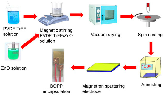 At room temperature, the PVDF-TrFE powder and N,N-Dimethylformamide were mechanically mixed for 60 min to obtain a transparent viscous clarified PVDF-TrFE solution; nano-ZnO with a particle size of about 30 nm. Acetone, n-Propylamine (PA) and 1H, 2H, 1H, 2H, perfluoroalkyltriethoxysilanes (PFOES) were mixed by ultrasonic stirring at room temperature for 30 min, and a transparent and clarified nano-ZnO dispersion was obtained. The nanometer ZnO dispersion was injected into the PVDF-TrFE solution with a mass fraction of 0%, 1.5%, 4.5%, 7.5%, 10.5% or 12.5%. It was then magnetically stirred to obtain translucent homogeneous PVDF-TrFE/nano-ZnO solution with different nano-ZnO content.