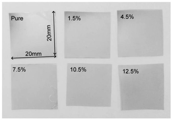 After the above steps, the pure PVDF-TrFE piezoelectric film and the PVDF-TrFE/nano-ZnO piezoelectric films with 1.5%, 4.5%, 7.5%, 10.5%, and 12.5% nano-ZnO doping, respectively, were prepared as shown in Figure 2, and the size of the prepared film was 20 mm × 20 mm. The finished PVDF-TrFE/nano-ZnO piezoelectric sensors with 7.5% nano-ZnO doping are shown in Figure 3, and the effective size was 20 mm × 17 mm. Figure 4 shows the cross-sectional structure schematic of the PVDF-TrFE/nano-ZnO piezoelectric sensor based on the actual structure.