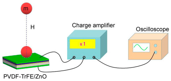 For a better understanding of the difference of piezoelectric properties, the piezoelectric output properties of PVDF-TrFE/nano-ZnO film sensors with different nano-ZnO content in the actual environment were tested by impact experiments. Using a 25 mm diameter steel ball (mass of 65.0 g), which was dropped at different heights, as the input energy of the PVDF-TrFE/nano-ZnO piezoelectric sensor, the voltage signal generated by the sensor was amplified by one times the charge amplifier (Yangzhou KD5007, Kedong Electronic Co., Ltd., Yangzhou, China); the charge signal was converted into a voltage signal; and the output signal of the sensor was recorded by a digital storage oscilloscope (ISDS205B, Instrustar Electronic Technology Co., Ltd., Harbin, China). Five experiments were performed at each height, and the average value was taken as the output signal under different impact energy. The experimental test device is shown in Figure 5.