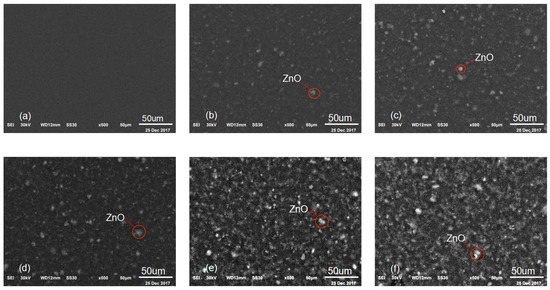 Figure 7 shows the dispersion of nano-ZnO dopants by scanning electron microscope of PVDF-TrFE/nano-ZnO films with different nano-ZnO contents at 50 µm scale. Figure 7a shows the microscopic morphology of pure PVDF-TrFE. Figure 7b–f shows the nano-ZnO dopants dispersion of PVDF-TrFE/nano-ZnO with nano-ZnO content 1.5%, 4.5%, 7.5%, 10.5% and 12.5%, respectively. It can clearly be seen that, with the increase of nano-ZnO content, the clustering part of nano-ZnO gradually increased. The reason is that there are many suspension bonds and unsaturated bonds on the surface of ZnO nanoparticles; they have high activity and instability; and they are easy to combine with other atoms and tend to be stable. Meanwhile, the dispersion of nano-ZnO can be improved significantly by using of the surface modification method. According to our previous study, the distribution of nano-ZnO in the PVDF-TrFE/nano-ZnO film with modifier PA and a silane coupling agent is more uniform and the dispersion is better [30].