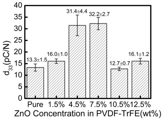 The piezoelectric strain constant d33 of the PVDF-TrFE/nano-ZnO piezoelectric film with different nano-ZnO content was measured, as shown in Figure 8. The addition of nano-ZnO into PVDF-TrFE could increase the piezoelectric strain constant of the film. When the ZnO content was 7.5%, the piezoelectric strain constant d33 of the PVDF-TrFE/nano-ZnO film was the largest, 142% higher than that of the pure PVDF-TrFE. These changes in value of d33 could be attributed to three factors. Firstly, from the internal performance mechanism of the film, the interaction between nano-ZnO surface charge and PVDF-TrFE dipole could improve the crystallinity of β-phase [25], and the influence of static friction between nano-ZnO particles and PVDF-TrFE particles on the chain arrangement of PVDF-TrFE could also promote the formation of β-phase [29]. This conclusion can be confirmed by the WXRD spectrum in Figure 6. Secondly, according to the principle of piezoelectric effect, under the action of external force, the PVDF-TrFE/nano-ZnO piezoelectric film generates a potential field and distributes it along the longitudinal direction. Because the dielectric properties of PVDF-TrFE and nano-ZnO were different, the distribution of potential in the film was not uniform. Therefore, a lateral additional potential field was generated between PVDF-TrFE and nano-ZnO, which played a role in increasing the piezoelectric strain constant d33 [31]. Thirdly, under the action of external forces, because the elastic moduli of the PVDF-TrFE and nano-ZnO materials were different, the strain of the two materials was different, which also led to the existence of additional stress inside, improving the detection of the piezoelectric output, that is, increasing the piezoelectric strain constant.