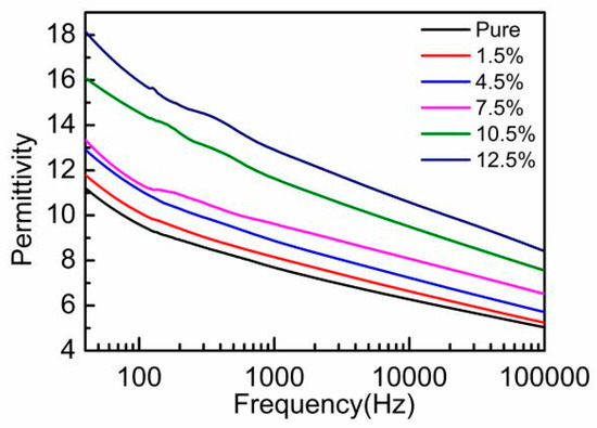The relationship between the relative permittivity and frequency of PVDF-TrFE/nano-ZnO films with different nano-ZnO contents is shown in Figure 9. The dielectric constant decreased with the increase of frequency. The reason was that, when the applied electric field frequency increased, the charge movement speed was lower than the change speed of high-frequency electric field, so the polarization decreased and the dielectric constant decreased with the increase of frequency.