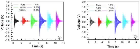 The output signals of PVDF-TrFE/nano-ZnO sensors with different nano-ZnO contents under different impact energy are shown in Figure 10. The output voltage of the PVDF-TrFE/nano-ZnO piezoelectric sensor was larger than that of the pure PVDF-TrFE piezoelectric sensor under the same impact energy. With the increase of nano-ZnO content, the output voltage increased first and then decreased; for the same sensor, as the impact energy increased, its output performance also increased. The output voltage of different PVDF-TrFE/nano-ZnO piezoelectric sensors changed with nano-ZnO content, as shown in Figure 11. With the increase of nanometer ZnO content, the output performance of PVDF-TrFE/nano-ZnO piezoelectric sensor first increased and then decreased, which is consistent with the rule of basic parameters measured by PVDF-TrFE/nano-ZnO film. When the nano-ZnO content was 7.5%, the output voltage of the PVDF-TrFE/nano-ZnO piezoelectric sensor was about four times that of the pure PVDF-TrFE sensor.
