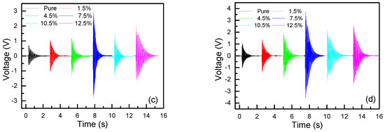 The output signals of PVDF-TrFE/nano-ZnO films with different nano-ZnO contents under different impact energy: (a) 54 mJ impact energy; (b) 109 mJ impact energy; (c) 219 mJ impact energy; and (d) 329 mJ impact energy.