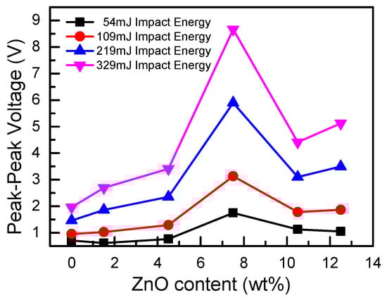 Peak-to-peak voltage versus impact energy curves of PVDF-TrFE/nano-ZnO films with different nano-ZnO contents.