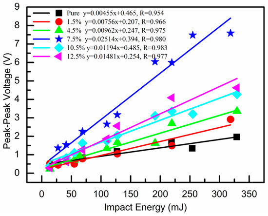 The measured output voltage versus impact energy is shown in Figure 12, where the scatter represents the experimental data, the straight line represents the fitted data, R represents the linear correlation coefficient, and the fitting equation is given. It can be clearly seen that the increase of nano-ZnO content improved the output performance of the piezoelectric sensor and the sensitivity to the impact energy at the same time. The prepared PVDF-TrFE/nano-ZnO piezoelectric sensors had better linearity of output performance and impact energy; all sensors reached above 0.96. According to the fitted linear equation, when the nano-ZnO content was 7.5 %, PVDF-TrFE/nano-ZnO piezoelectric sensor had the maximum impact sensitivity, which was about 0.025 v/mJ.