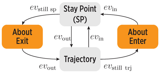 We model an individual’s mobility as a sequence of states, as shown in Figure 2. The transitions between states are handled by the working memory of our system, based on the input stimuli and the learned mobility in the map, e.g., the regularity of individual’s routines. Besides enter and exit events, there are also events linked to no changes in mobility, i.e., the user is still inside a stay point () or in a trajectory (). Such events are relevant to detect mobility inconsistencies, as described later on.