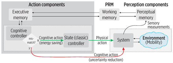 A Cognitive Controller (CC) within a CDS architecture, adapted from [5]. A classic controller produces a physical action if observed mobility is consistent with learned mobility (green arrow). Uncertainty is reduced by increasing the observations in perception (red arrow).