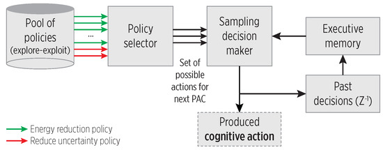 The functional blocks of the proposed CC, adapted from [5]. A pool of explore-exploit policies provides the sampling decision maker with cognitive actions.