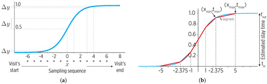 The motion state transition during visits could be modeled by a sigmoid function, . Note from Figure 5a that the sigmoid non-linearity can be exploited to map a sampling sequence with a fast rate during a visit’s start and end, and a slower sampling rate i the middle. The sigmoid generates the sampling during the state, using the stay times of the predictions provided by the working memory.