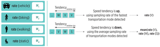 Each transportation mode is associated with a specific sampling rate. The sampling policy uses the detected speed tendency as follows: