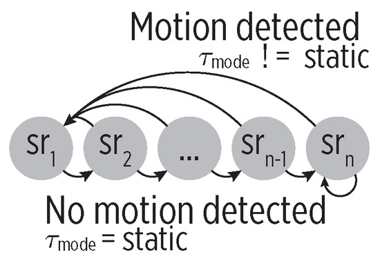 The sampling policy for the state. The HAR-based motion detection controls the transitions to adjust the sampling rate. The lack of motion causes the transitions from the fast-rate initial states () to the slow-rate ending states ().