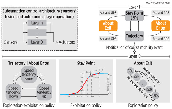 We defined three sampling policies as cognitive actions. The stay point and trajectory state policies are for regular mobility ( and , respectively). The about exit policy is selected during the state (the user has not left the place at the predicted time). For the state, the trajectory state policy is selected because the user is still moving toward a stay point, and the accuracy of the tracking must be ensured.