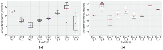 For both 1-Hz and 30-s trajectories, all of the stay points were detected, and users confirmed this. Figure 10 shows the average enter time difference, which was short as the CDS used a trajectory policy when the users arrived at stay points. Similarly, Figure 11 shows the exit time difference. Although the sigmoid reduces the sampling rate, it does not produce a significant impact on the temporal accuracy, yet it reduces the energy consumption.