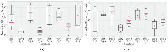 Exit time differences (). (a) For 1-Hz trajectories, values are within 65 and 165 s, aligned with the parameters of the sigmoid sampling (a theoretical maximum of 360 s). (b) For 30-s trajectories, the differences are shorter than in the 1-Hz trajectories due to reduced ground truth data.