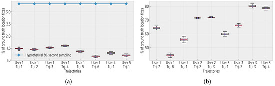 The proportion of saved location fixes. (a) For the 1-Hz trajectories, the CDS used an average of 1.42% of the ground truth fixes and 43% of a hypothetical 30-s sampling. (b) For the 30-s trajectories, the CDS used an average of 65%. Notice that the sigmoid configurations with the largest values used the lowest number of fixes.