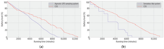 Smartphone batteries’ burnout for the CDS and existing approaches. (a) For the Agnostic GPS sampling system trial, the CDS increased the battery life by a factor of 1.3 (0.23 energy gain). (b) For the Senseless-like implementation, the CDS increased the battery life by a factor of 1.6 (0.53 energy gain).