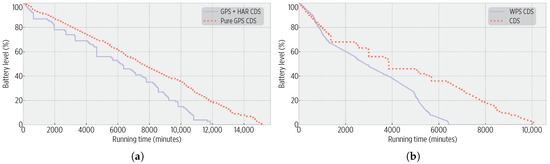 Smartphone batteries’ burnout: (a) For the GPS + HAR CDS vs. Pure GPS CDS trial; the Pure GPS CDS increased the battery life by a factor of 1.2 (0.26 energy gain). (b) For the GPS + HAR CDS vs. WPS CDS; the GPS + HAR CDS increased the battery life by 1.57 factor (0.39 energy gain).