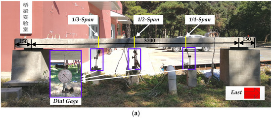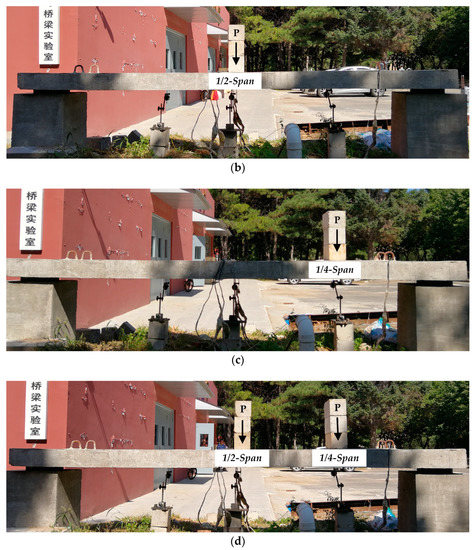 The static tests were arranged as confirmatory test to verify the correctness of the bridge deflection calculation method proposed in this paper and were not carried out during the period of monitoring. The measure point deflection of simply supported slab bridge was measured by dial gage, of which the precision is 10−2 mm. Three dial gages (shown in Figure 5a) were placed at 1/4, 1/2, and 1/3 of the calculated span length from east to west, which were defined as 1/4-Span, 1/2-Span, and 1/3-Span, respectively. Three loading configurations were designed and implemented as shown in Figure 5b,d, namely, Case 1 with a single load located at 1/2-Span, Case 2 with a single load located at 1/4-Span and Case 3 with two single loads located at 1/2-Span and 1/4-Span. Mass of a single load is 48 kg, in other words, load P is 470.4 N. Every case was measured four times for both the static and dynamic tests of confirmatory test so as to avoid the effect of test errors.