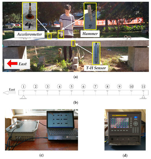 DH131E accelerometers produced by the same manufacturer of DH5922 system are selected as the vibration sensors. The accelerometer features a sensitivity of 1 mV/g and has the advantages of large frequency range (1–8000 Hz), small size (φ10 × 16 mm) and light weight (5.5 g). The operating temperature of DH131E accelerometer ranges from −40 to 80 °C, which can be applied in outside environment. An impulse hammer manufactured by Wuxi Yutian Technology Corporation is used in this test and it features a pressure range of 0–60 kN and a sensitivity of 4.12 pC/N. Its operating temperature ranging from −50 to 150 °C makes it ideal for outdoor application. The accelerometer and impulse hammer are depicted in Figure 6a.