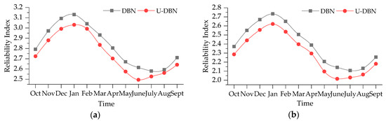 - The bridge deflection time-dependent RIs of Cases 1 and 3 were calculated by MC method. The results illustrated the RI reached maximum in January and minimum in July, and was also negatively correlated with environment temperature. The RIs calculated through U-DBN were not precise enough and underestimated the bridge deflection reliability. Vehicle load limitation can be provided reasonably through the reliability calculation method proposed in this paper.