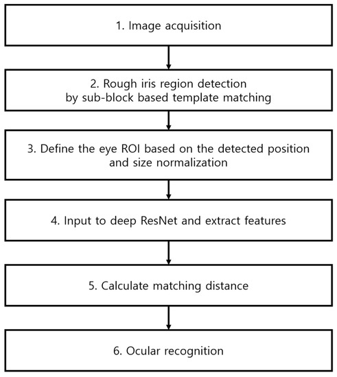 This paper is organized as follows: Section 2 compares the advantages and disadvantages of existing iris and ocular recognition methods. Section 3 describes the contributions of this study and Section 4 shows ocular recognition using the deep residual network (ResNet) proposed in this study. Section 5 presents the experimental results and analysis, and Section 6 presents the conclusions of the study.