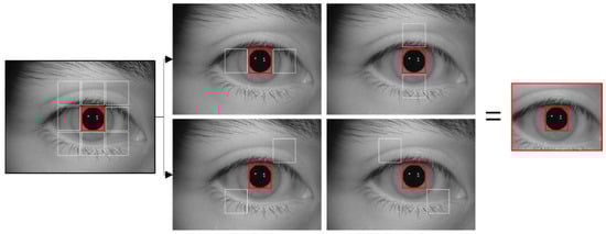 This study performs sub-block-based template matching to find a rough iris area in the input iris images. This algorithm uses a sub-block based template to find a rough eye area. The central sub-block is set as the initial search location, and eight sub-block areas are set in the up, down, left, right, and diagonal directions. After this, the mean values of the pixels with the areas in the up, down, left, right, and diagonal directions are compared. If the center value is not the lowest value, the algorithm moves to the next search area, and the process is repeated to find the location with the lowest value [40]. Moreover, to quickly search an image with this process, an integral image is calculated, and processing is performed based on this [41]. The sum of the area’s pixels obtained in this way is calculated for nine sub-blocks, as shown in Figure 2. Then, the position where the mean pixel value of the central sub-block in a certain location and the mean pixel value of its surrounding eight sub-blocks become the minimum vale is determined as the rough pupil location.
