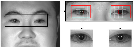 Of the three open databases used in this study, the CASIA-Iris-Distance database includes a large face area that includes both eyes in the input images as shown in Figure 3. As such, false detection cases, in which areas outside of the eye are improperly detected, can occur during eye detection that uses the described sub-block-based template matching alone. To resolve this problem, the present study uses the Adaboost eye detector in a search region that includes both eyes in the input image, as shown in Figure 3. The pupil and ocular ROIs are found within this region through sub-block-based template matching.