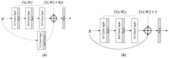 The existing CNN architectures that have been studied have demonstrated very good performance in the field of image processing and recognition. Various CNN models have been introduced, including AlexNet by Krizhevsky et al. [42], which comprises five convolutional layers (CL) and three fully connected layers (FCL), and Visual Geometry Group (VGG)-Net by Simonyan et al. [43], which comprises 16 or 19 CLs and three FCLs. Through these studies, it was discovered that performance improves as the layer depth increases. The architecture used in this study, deep ResNet, typically has 50, 101, or 152 layers [44]. If the depth of the layers increases without any supplementation, the training accuracy decreases when a learning is performed, and the model cannot converge on the global minimum. This is because features are lost as the model continues to go through processing and the existing image features are reduced through continued calculations. A previous study [44] resolves this problem using the concepts of short-cut (skip-connection) based residual blocks and identity mapping, as shown in Figure 4.