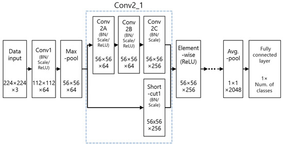 As shown in Table 2, each convolution layer comprises an accumulation of residual blocks. Each residual block comprises convolution layers with three small filter sizes of 1 × 1, 3 × 3, and 1 × 1, and this is called a bottleneck design. It performs fewer calculations than processing two 3 × 3 convolutions, and the performance is similar or better [44]. To reduce the output feature map size to half when each convolution layer starts as the residual blocks accumulate, the stride of the block’s first 1 × 1 convolution layer is set to 2 to reduce the feature map size, and the strides of the other blocks are set to 1 to maintain the feature map size as it is. Likewise, in the case of the shortcut, a 1 × 1 conv + BN is performed in the first shortcut to match the number of channels in order to reduce the feature size of each convolution layer. In the other shortcuts, the 1 × 1 conv is not performed and identity mapping which preserves the features is performed through an elemental-wise summation of the output of the previous block as it is. Figure 5 shows the residual blocks in more detail. Conv2_1 refers to the first block of Conv2 in Table 2. The three items in this block, Conv 2A, 2B, and 2C, refer to the 1 × 1, 3 × 3, and 1 × 1 filter sizes and convolutions, respectively. The scale in Figure 5 shows the magnification operation of the feature map value.