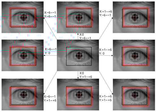 For the training data, data augmentation was performed on the ROI areas found through the sub-block based template matching described in Section 4.2. Six pixels of translation and cropping in the up, down, left, and right directions were performed as shown in Figure 6 to augment the data by a factor of 169. Such translation and cropping-based data augmentation has been widely used in previous studies [42]. Through this, the misalignment between the enrolled and recognition images can be covered through CNN training, and the problem of inadequate training due to a small dataset can be resolved.