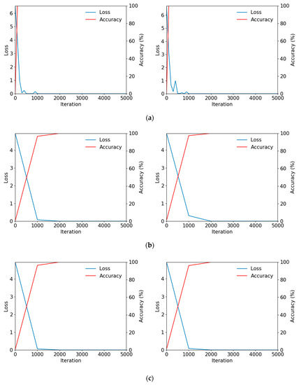 In the tests, the ResNet-50, 101, and 152 models were used to perform fine-tuning via the described augmented training data. During training, a stochastic gradient descent (SGD) optimizer [50] was used. Here, optimization was performed using a step policy as the learning rate policy, in which the gamma value was multiplied every fixed iteration. As one of SGD’s features, training was performed in the unit of mini-batch sizes. The number of iterations was calculated as the “number of training data/mini-batch size,” and the number of iterations here was defined as 1 epoch. In this study, training was performed for 3–10 epochs for each model. The learning rate was 0.0001. A small learning rate was used because fine-tuning was being performed using existing learned weights; the momentum value was 0.9, weight decay was 0.0001, and the gamma value was 0.1. Because the number of images in each dataset varied, the number of steps varied to match this and find optimal performance. To calculate the training loss, the multinomial logistic loss was calculated using the softmax function. Figure 7 below shows graphs of the training loss and training accuracy obtained during the training of ResNet-50, 101, and 152. As shown in Figure 7, as the training iterations increase, the training loss converges near 0 and the training accuracy converges near 100%. This shows that the training of the CNN model used in this study was performed successfully.